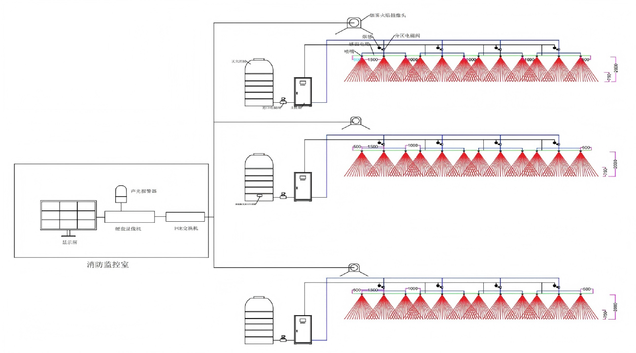 主要由水系灭火剂、 灭火剂容器箱、 驱动泵组、不锈钢管道、 阀门、 喷头、 集中监控系统等组成。