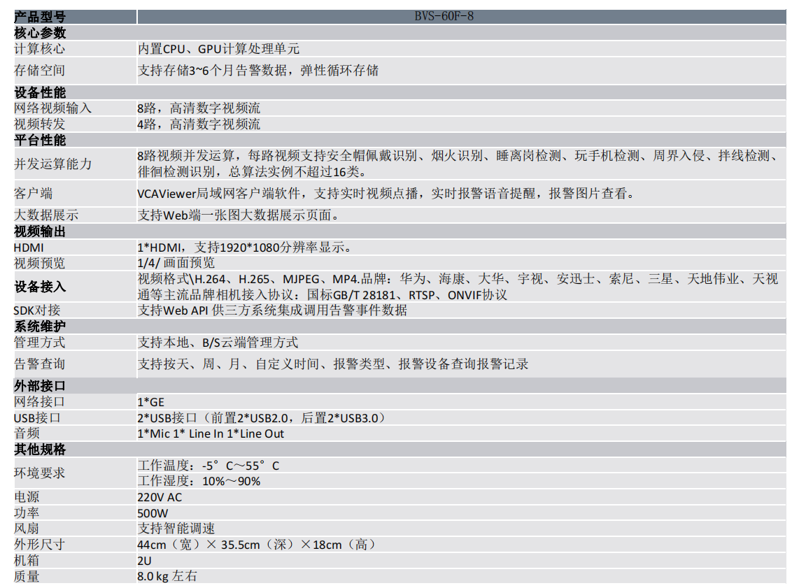 性能高、应用灵活 ■ 8路网络视频接入,1000Mbps视频输入带宽 ■ 支持视频与图片混合存储 ■ 支持单机、多机组网模式,可靠性高 ■ 支持缓存补录技术,保证视频数据的完整性 ■ 支持录像锁定功能,保护重要录像在指定周期内不被覆盖 ■ 采用嵌入式win10操作系统(未激活) ■ 支持7×24 小时稳定运行多种智能分析 ■ 支持算法:安全帽佩戴识别、烟火识别、睡离岗检测、玩手机检测、周界入侵、拌线检测、徘徊检测识别