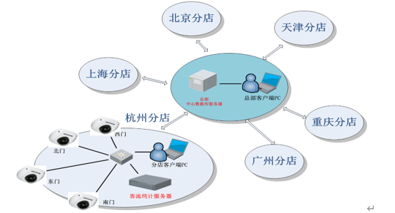 百货各门店与百货集团总部通过VPN连接,各门店部署有专门的业务数据库。根据百货集团总部需求,客流统计系统部署在各个门店,并直接将客流数据写入门店业务数据库,与门店各项业务数据一起发送至百货集团总部,统一分析和管理。百货集团客流统计系统总体架构设计如图。