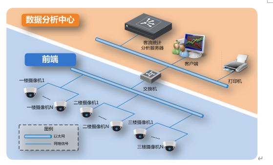 系统中包含的模块主要是用于采集视频的摄像机,客流统计服务器以及用于配置和管理的应用客户端。