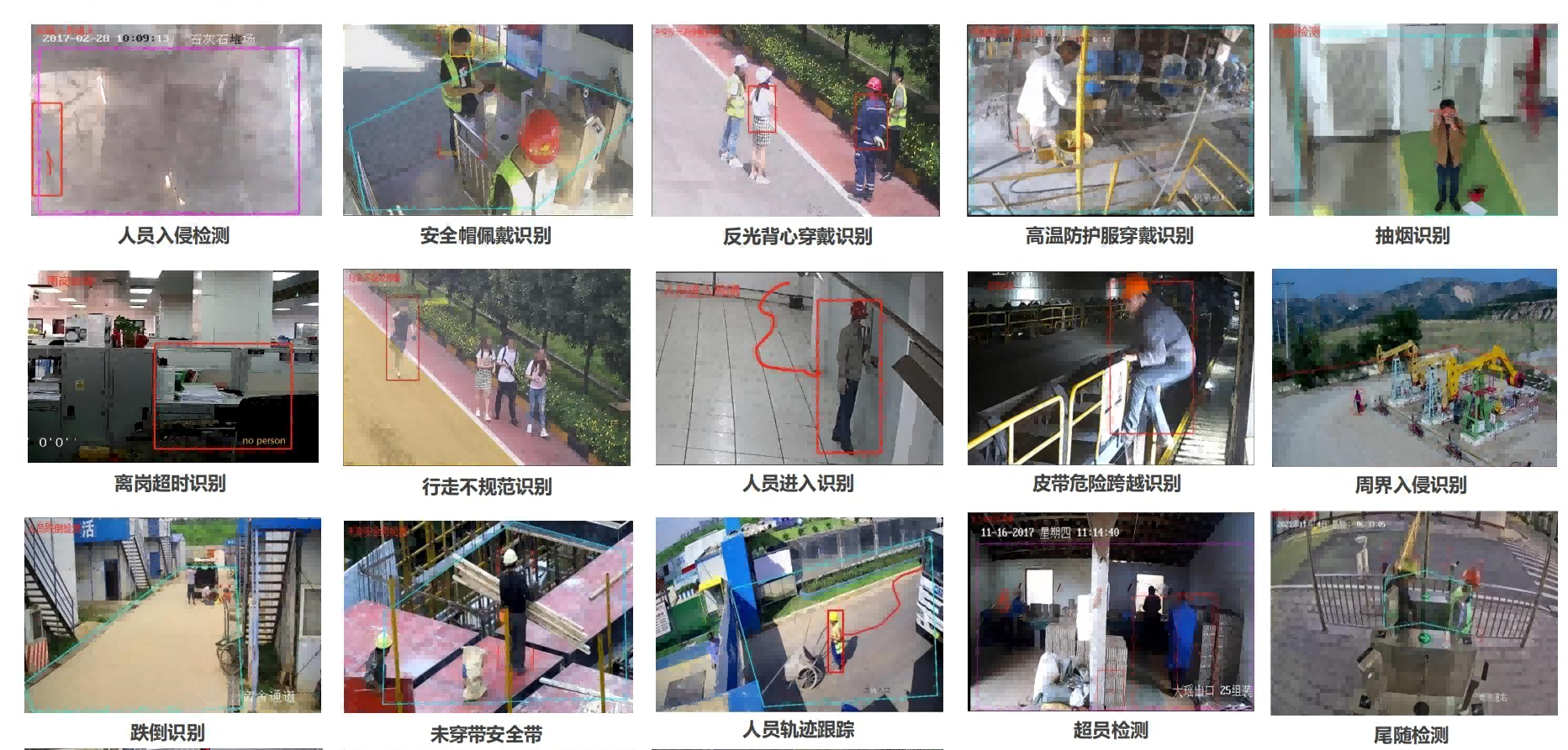 安全类:目标滞留、危险区域入侵、人员徘徊、奔跑检测、物品防盗检测、移动方向检测、移动路径检测、防尾随检测、烟火检测、未佩戴安全帽检测、未穿工作服检测、离岗、睡岗检测、爬高检测、摔倒检测、设备定时巡检检测、人群聚集检测、原油泄漏检测、攀爬护栏检测。