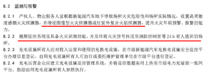 “设置电动汽车充电设施或存放电动汽车的汽车库应设置火灾自动报警系统,并宜设置具备火灾图像识别功 能的火灾自动报警系统;当汽车停车数量不大于10辆时,火灾自动报警系统可采用能够远程传输报警和故障信号的 独立式感烟火灾探测报警器。设置电动汽车充电设施或存放电动汽车且停车位大于100辆的停车场宜设置具备火 灾图像识别功能的火灾自动报警系统。”
