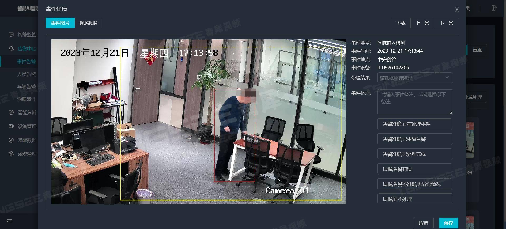 利用智能分析网关BVS内置的算法模型,可以自动识别区域入侵、周界入侵、区域人数超员、区域人数统计、区域人数异常、区域徘徊等行为检测,及时发现异常行为并抓拍和告警,系统能通过弹窗及声音进行告警消息提示,提醒管理人员及时查看和处理。