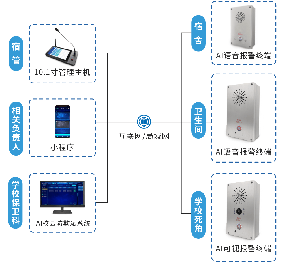 系统基于智慧物联技术、AI语音技术、大数据及实时音视频处理技术,集关键字呼叫报警、方言报警、按键报警、定位、远程管理为一体,组成了完整的校园防欺凌智能AI语音自动报警系统。
