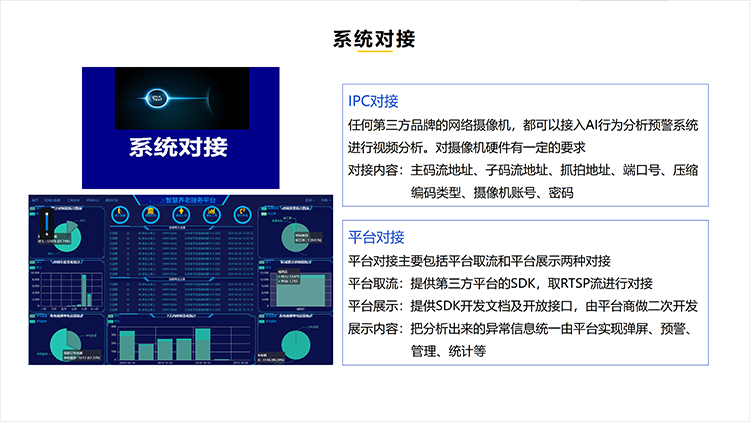 任何第三方品牌的网络摄像机,都可以接入AI行为分析预警系统进行视频分析。对摄像机硬件有一定的要求